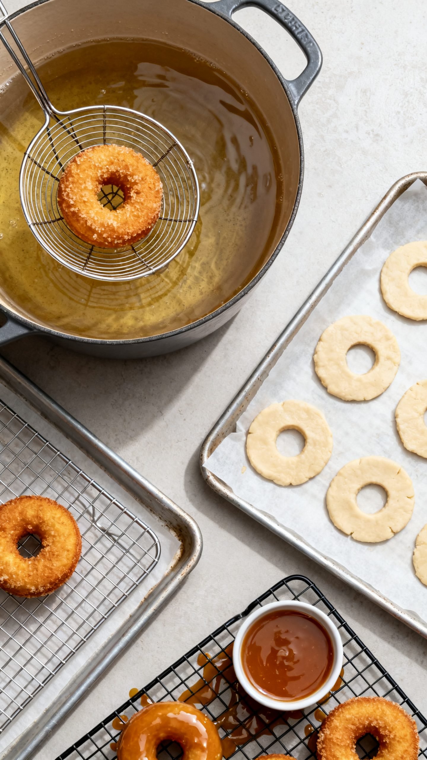 - Fry 2–3 donuts at a time for 1–2 minutes per side until deep golden with a crackly ring, adjusting heat to maintain temperature.