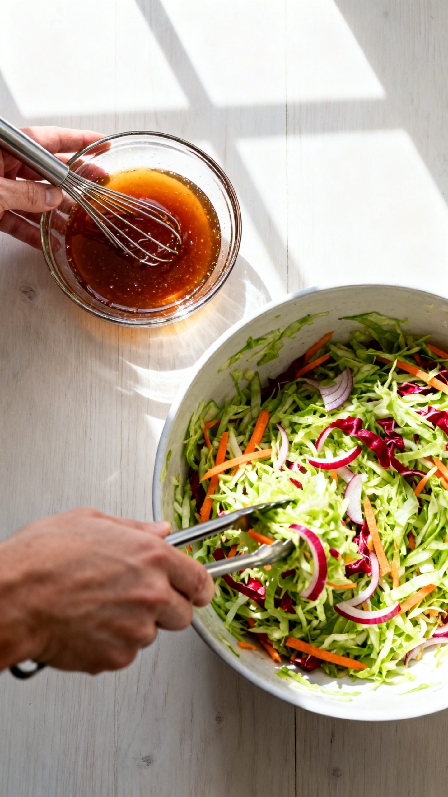 - Toss and season: Pour the dressing over the cabbage mixture. Toss for 1–2 minutes to coat every strand. Taste and adjust salt, pepper, or sugar to balance the tang.