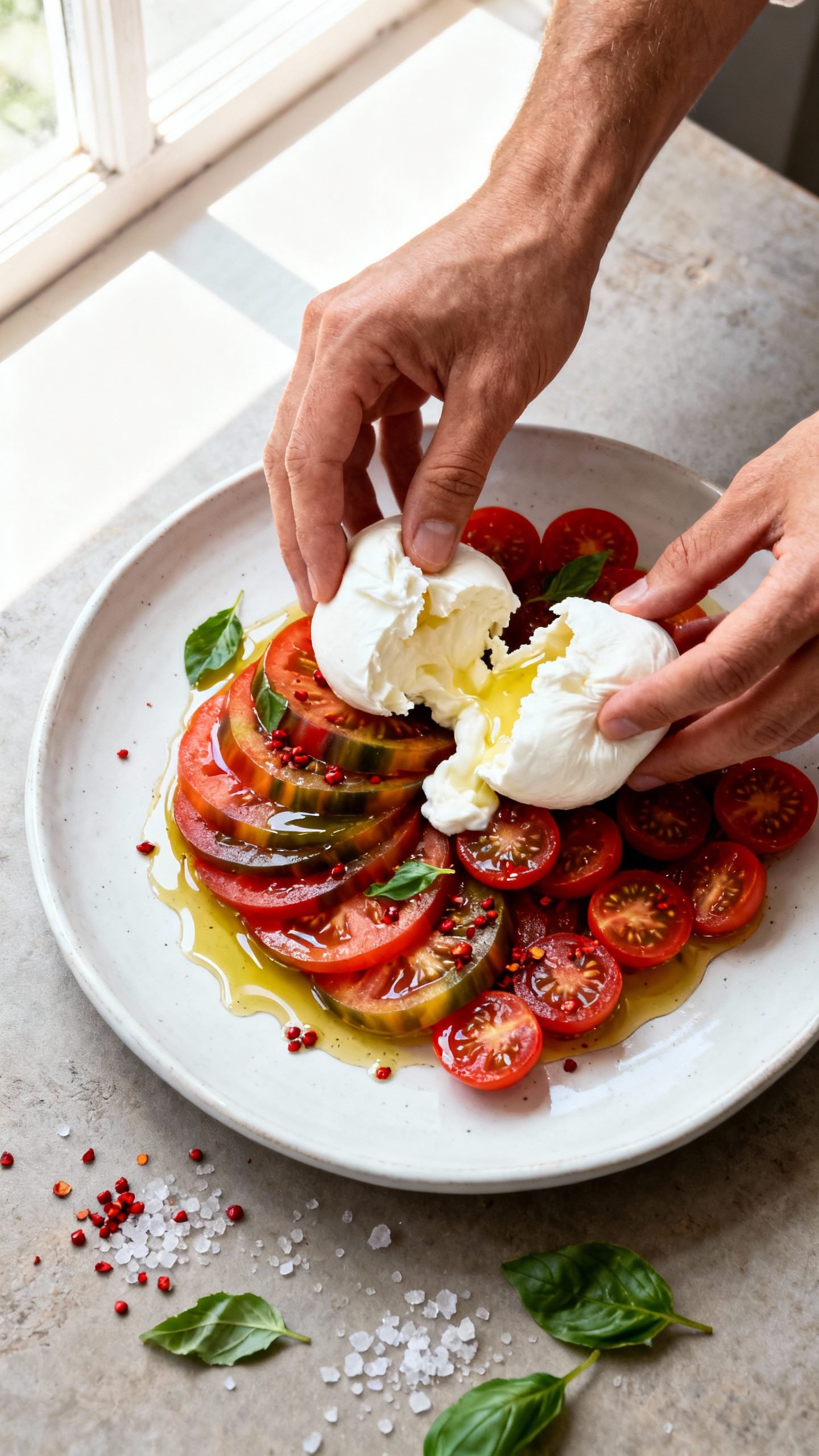 - Texture contrast: Juicy tomatoes, creamy burrata, and crunchy flaky salt create the best bite.
