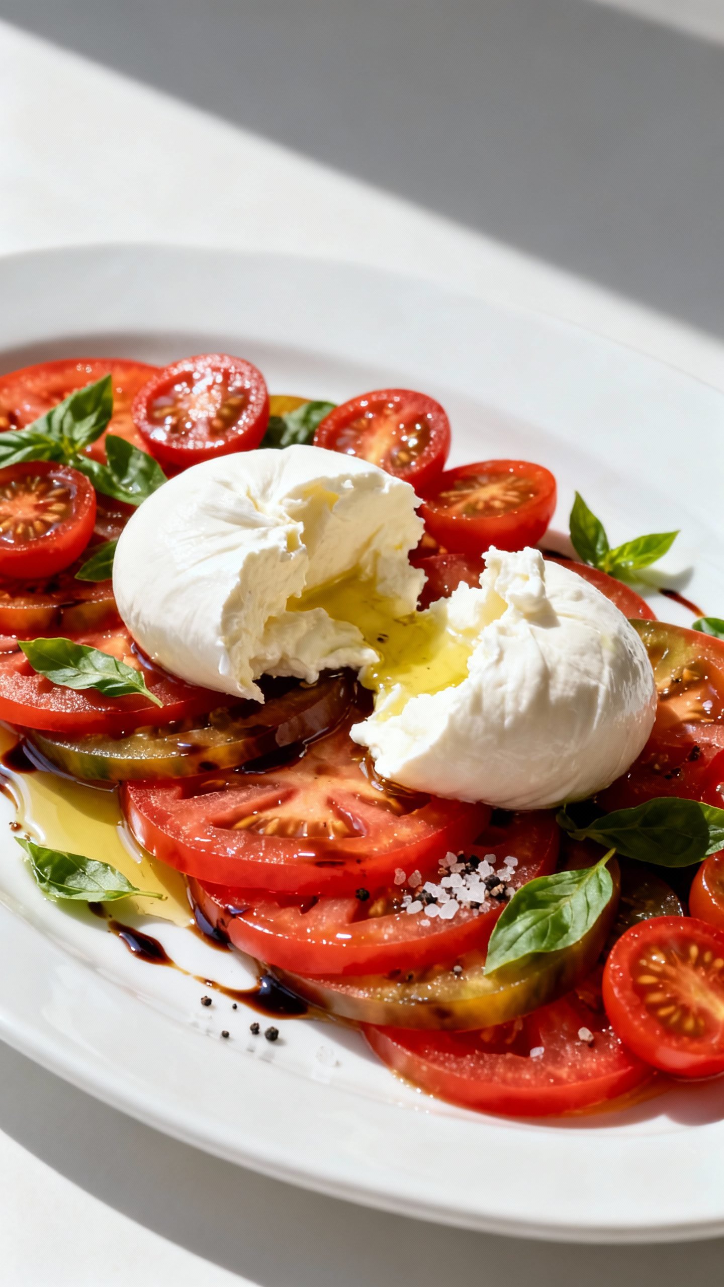- Add the burrata: Place the burrata balls on top. Gently tear them open so the creamy center spills over the tomatoes.